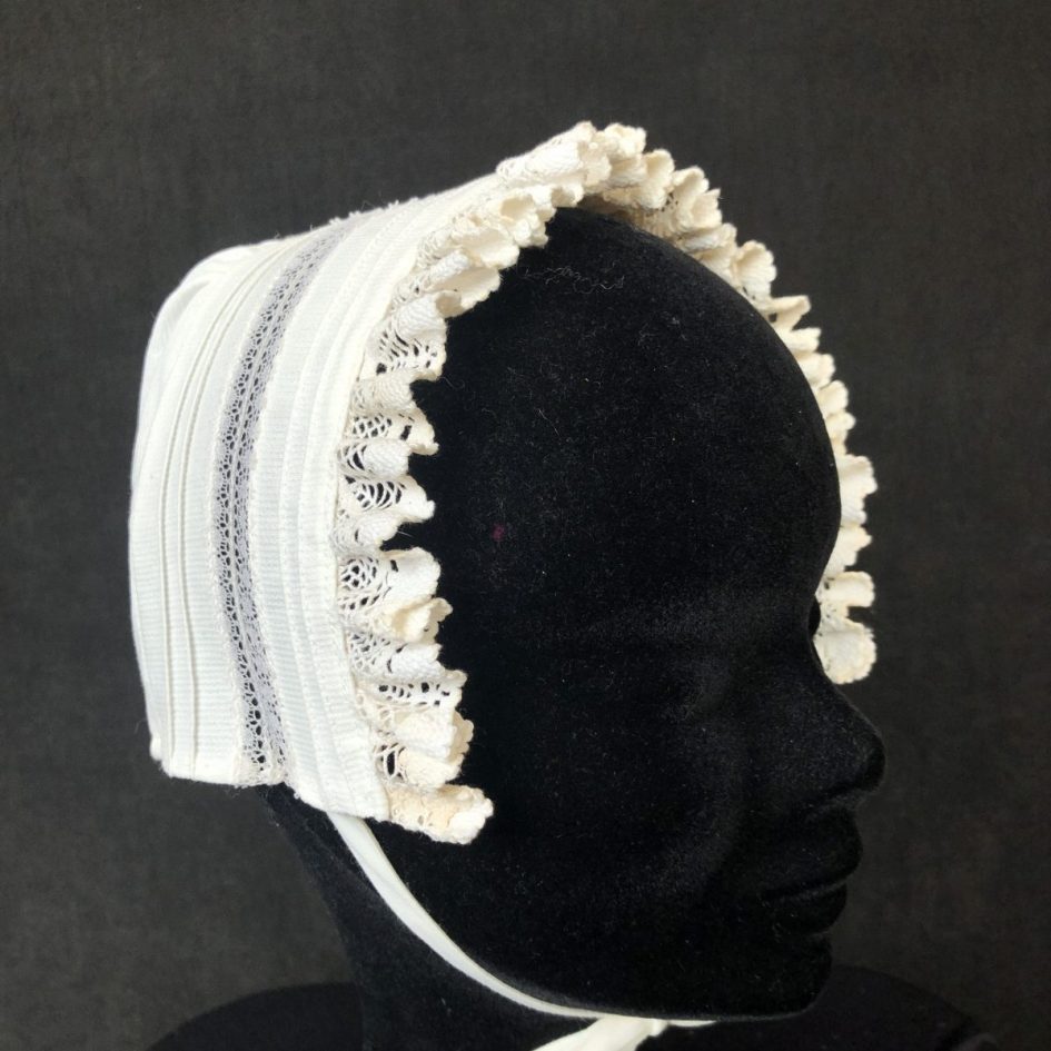 Réalisation de béguins en coton blanc et dentelle, à partir d’articles de référence